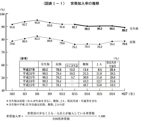 2015年度(3年おきなので現時点での最新データ)では、初めて生命保険の世帯加入率が90%を切ったとはいえ、これはかなり高い数値だと言えるでしょう。